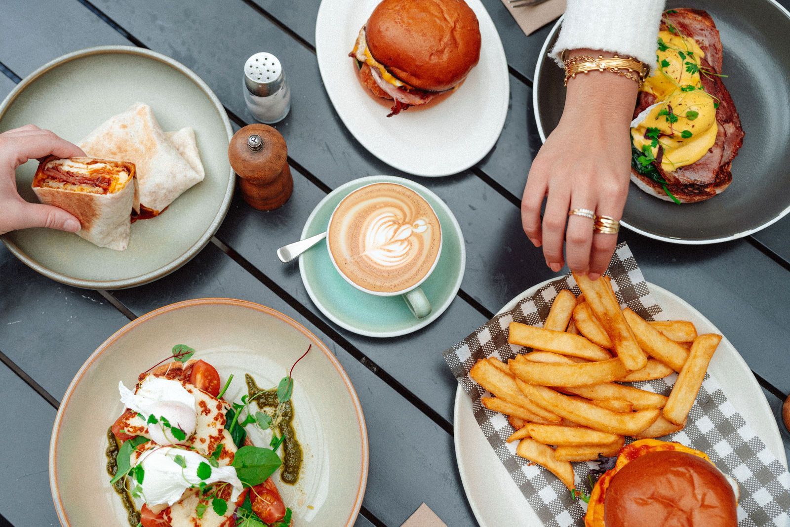 A table topped with plates of food and a cup of coffee.